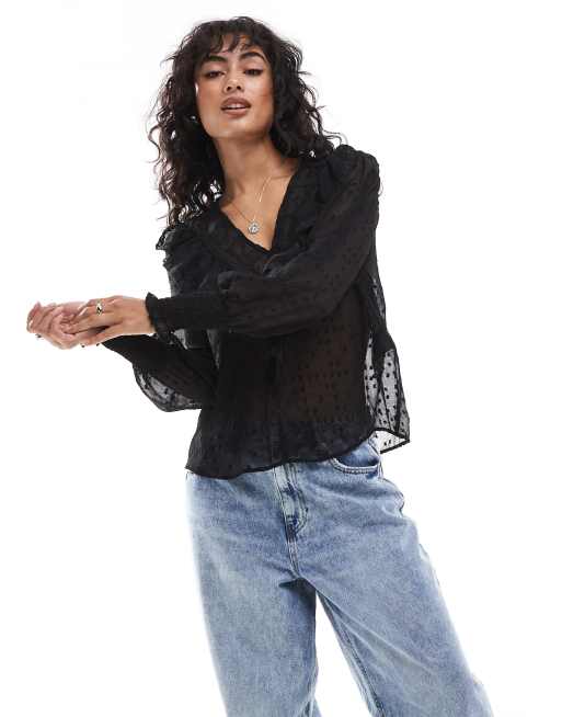 ONLY – Czarna prześwitująca teksturowana bluzka z dekoltem w szpic