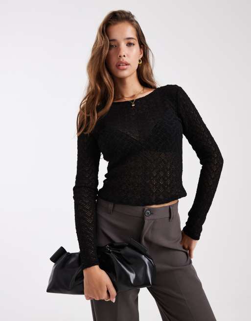 ONLY – Czarny koronkowy top z długimi rękawami i dekoltem w kształcie litery U