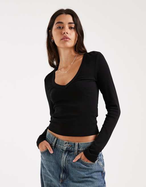 ONLY – Czarny top o pudełkowym kroju z długimi rękawami i dekoltem w szpic