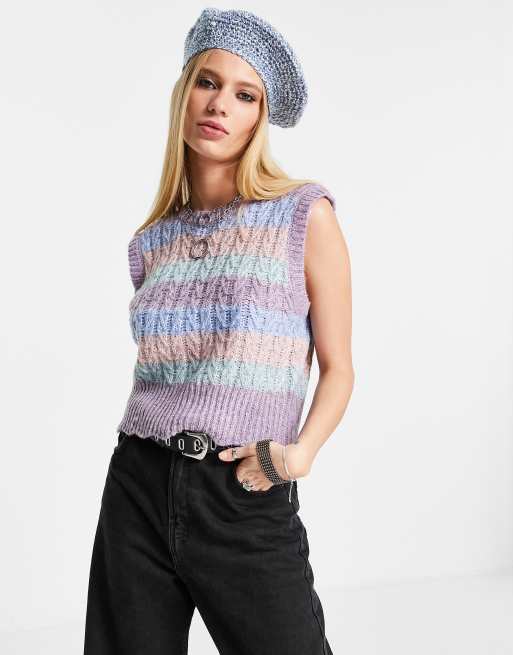 Only – Liliowa krótka kamizelka z dzianiny o warkoczowym splocie, w kolorowe pasy