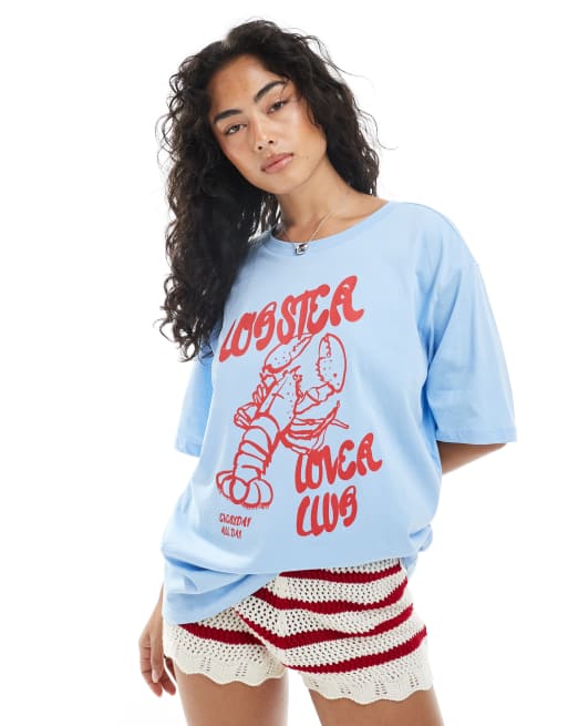 ONLY – Niebieski T-shirt o fasonie boyfriend z grafiką z homarem