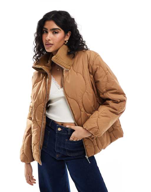Only – Piaskowy pikowany płaszcz z prążkowanym kołnierzem