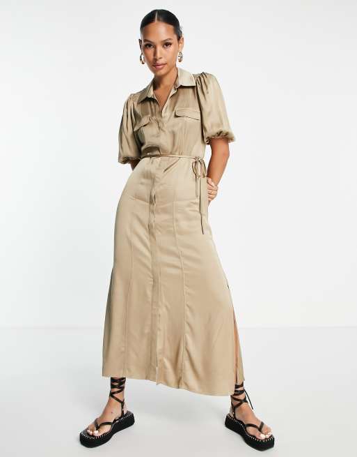 & Other Stories – Beżowa satynowa sukienka midi ściągana na sznurek w talii