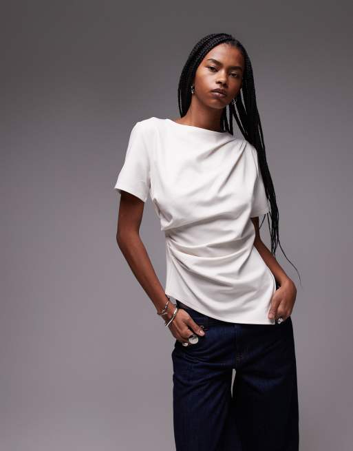 & Other Stories – Biały dżersejowy T-shirt z asymetrycznym rozcięciem i drapowaniem z przodu