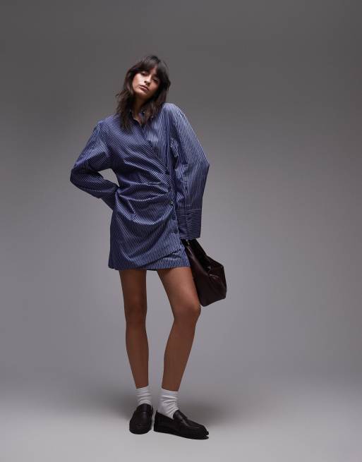 & Other Stories – Niebieska marszczona sukienka koszulowa mini z kopertowym przodem w paski