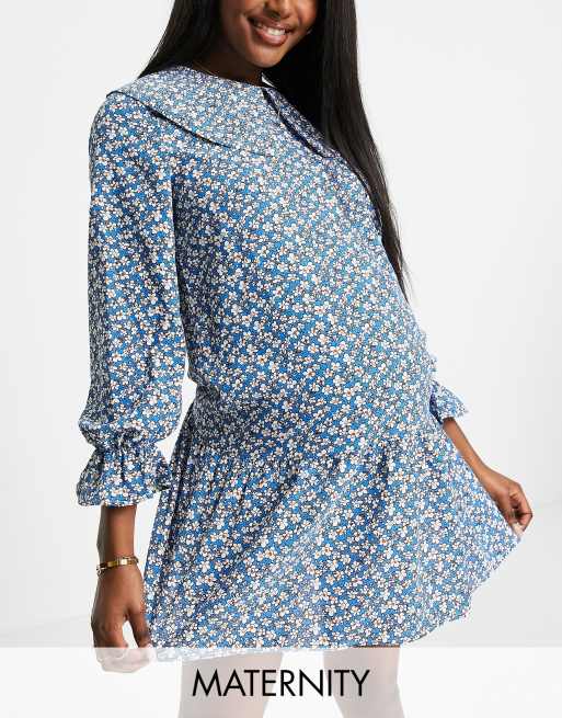 Pieces Maternity – Luźna niebieska sukienka mini z dużym kołnierzem, w drobny kwiatowy wzór
