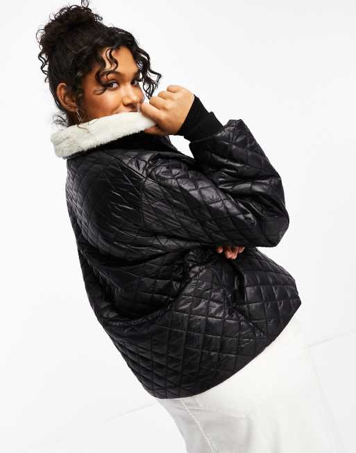 Pieces Curve – Czarna pikowana kurtka z kołnierzem ze sztucznego futerka