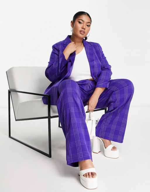 Pieces Curve – Fioletowy zestaw w kratę: marynarka i dopasowane spodnie