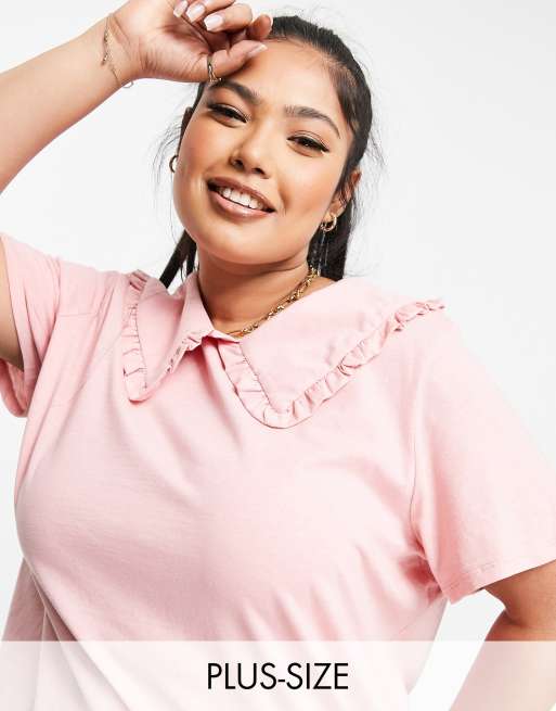 Pieces Curve – Różowy bawełny T-shirt z dużym kołnierzem z falbanką – LPINK