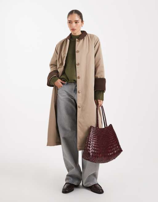 Pieces – Beżowy długi trencz ze sztruksowym kołnierzykiem