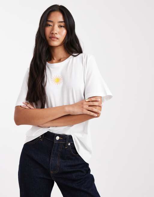 Pieces – Biały T-shirt z wyhaftowanym słońcem