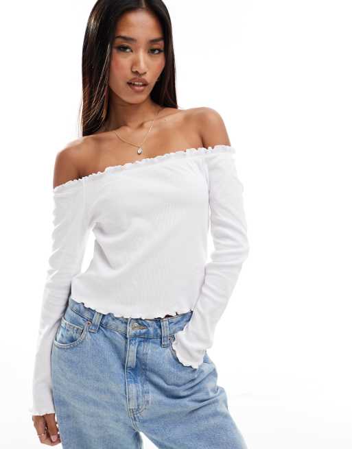 Pieces – Biały top z długimi rękawami, odsłoniętymi ramionami i karbowanym wykończeniem