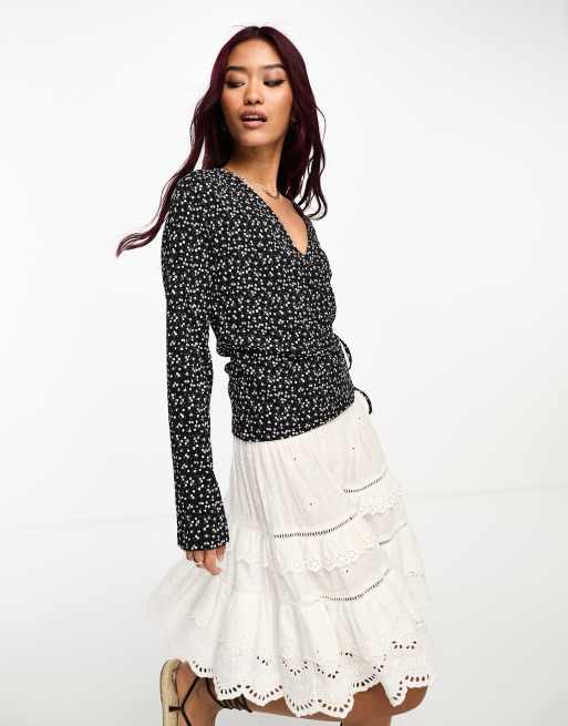 Pieces – Czarno-biała bluzka z kopertowym przodem w kwiatowy wzór