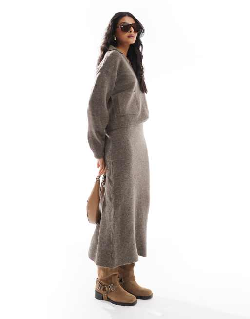 Pieces – Dzianinowa spódnica maxi w ciemnym szarobrązowym kolorze, część zestawu