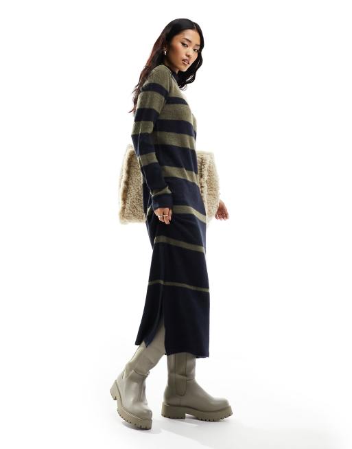 Pieces – Dzianinowa sukienka midi z golfem w paski w kolorze khaki i granatowym