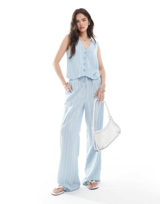 Pieces – Jasnoniebieskie spodnie z szerokimi nogawkami w paski, część zestawu