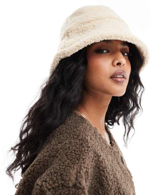 Pieces – Kremowy kapelusz typu bucket z kożuszka