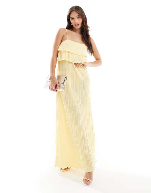 Pieces – Plisowana cytrynowa sukienka na ramiączkach z warstwowymi falbankami