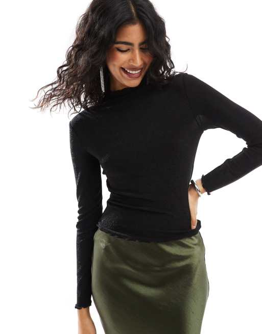Pieces – Srebrny brokatowy top z długim rękawem i karbowanym brzegiem