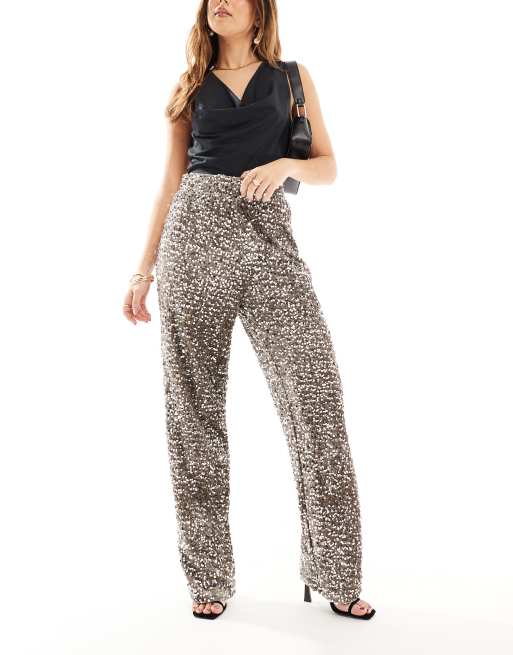 Pieces – Welurowe brązowoszare spodnie z szerokimi nogawkami i cekinami