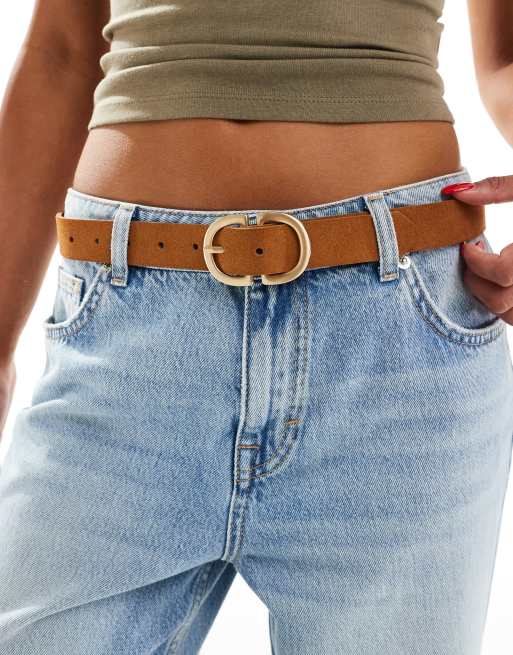 Pieces – Zamszowy pasek w kolorze koniakowym z podwójną złotą klamrą
