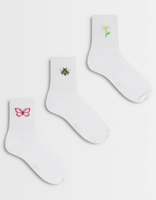 Pieces – Zestaw 3 par białych skarpetek do kostki z haftowanym wzorem