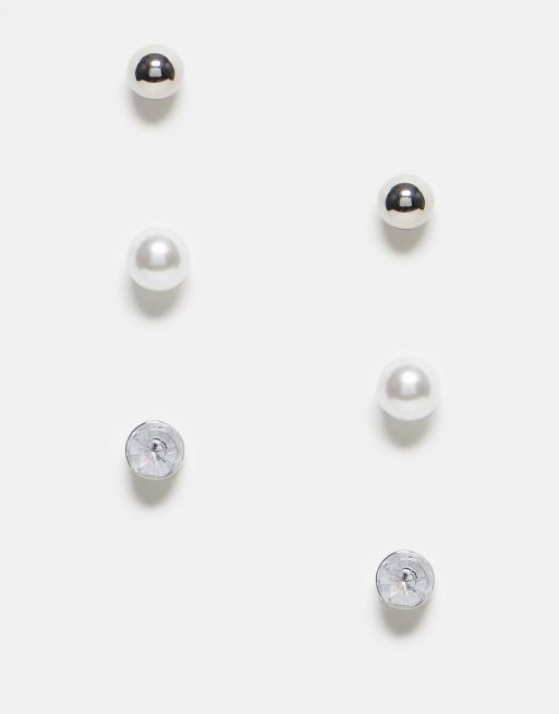 Pieces – Zestaw 3 par kolczyków-wkrętów z perełkami i kryształkami w kolorach srebrnym i białym