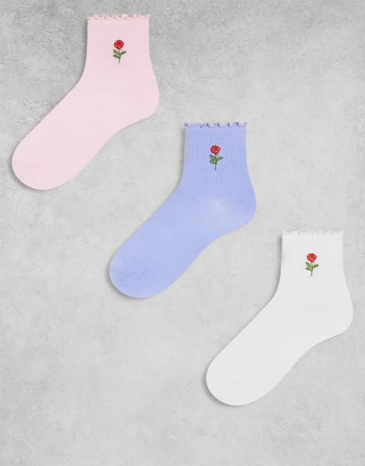 Pieces – Zestaw 3 par skarpetek w różnych kolorach z haftowanymi różami