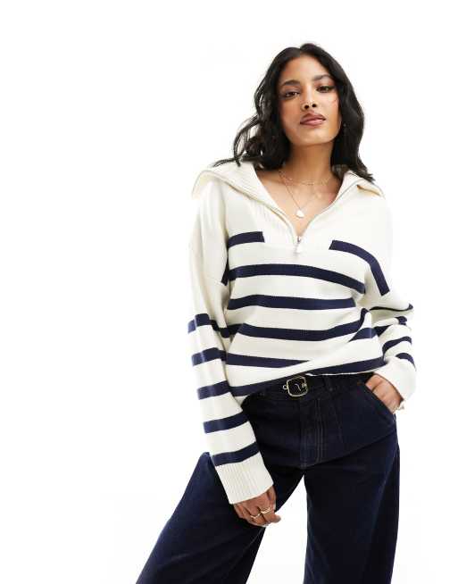Pimkie – Biało-granatowy sweter w paski z suwakiem pod szyją