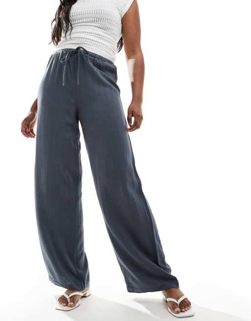 Pimkie – Szare ściągane na sznurek spodnie z szerokimi nogawkami z domieszką lnu