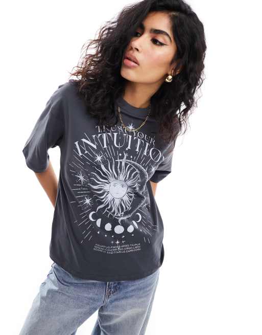 Pimkie – T-shirt w spranym szarym kolorze z motywem księżyca i słońca