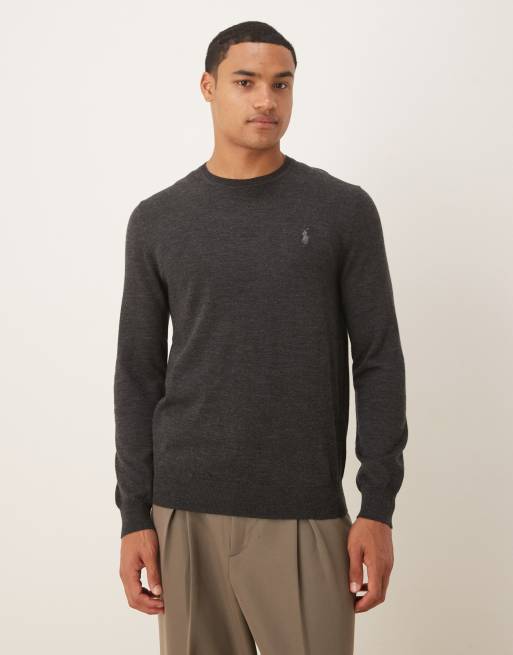Polo Ralph Lauren – Grafitowy melanżowy sweter z wełny merino z okrągłym dekoltem i logo