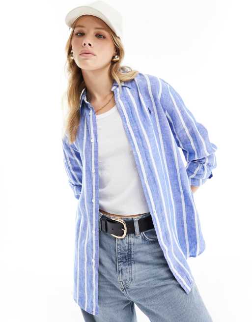 Polo Ralph Lauren – Niebiesko-biała lniana koszula w paski z logo