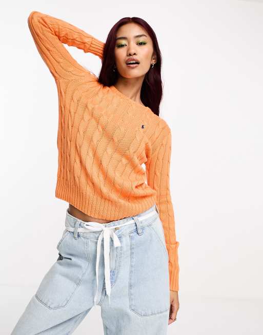 Polo Ralph Lauren – Pomarańczowy sweter z bawełny o warkoczowym splocie z logo