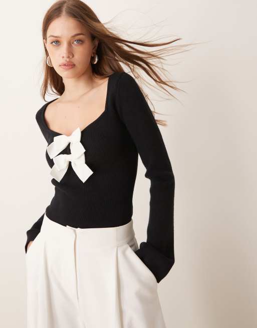 Pretty Lavish – Czarny dzianinowy top z białymi kokardkami