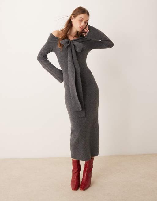 Pretty Lavish – Grafitowa sukienka midaxi z dekoltem bardot z kokardką