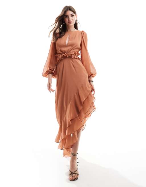 Pretty Lavish – Jasnobrązowa sukienka maxi z falbanką i wycięciem