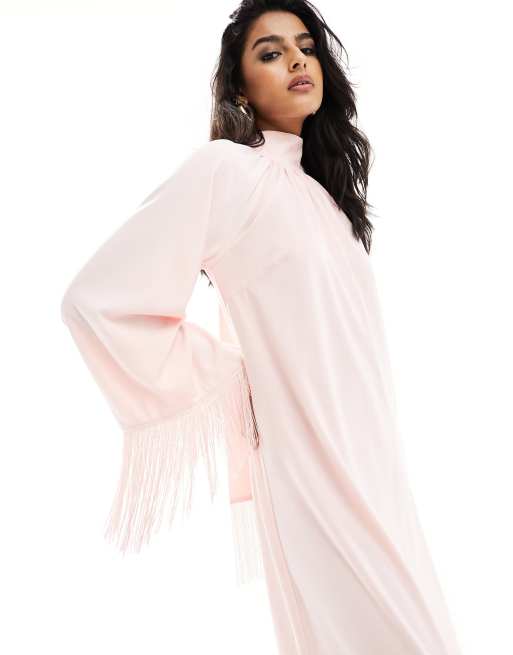 Pretty Lavish – Pudroworóżowa sukienka maxi na jedno ramię z frędzlami