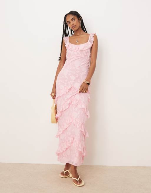 Pretty Lavish – Różowa sukienka maxi w żakardowy wzór z falbanką