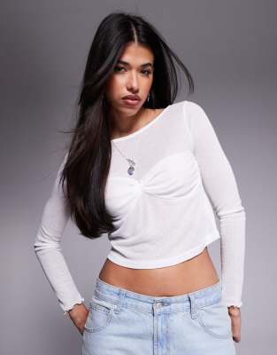 Princess Polly – Biały prążkowany top z długimi rękawami, prostym dekoltem i ozdobnym biustem