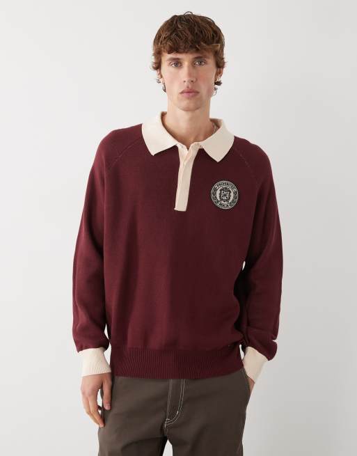 Prohibited – Bordowa koszulka polo oversize z długimi rękawami i naszywką z logo