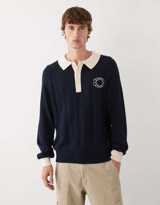 Prohibited – Granatowa dzianinowa koszulka polo oversize z długimi rękawami i emblematem z logo