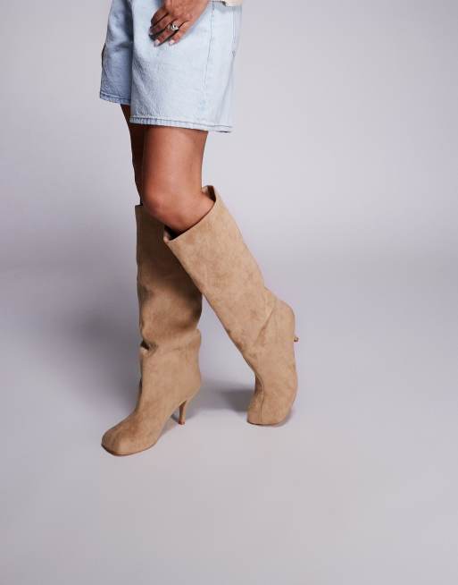 Public Desire – Bordeaux – Beżowe marszczone botki do kolan na obcasie z imitacji zamszu