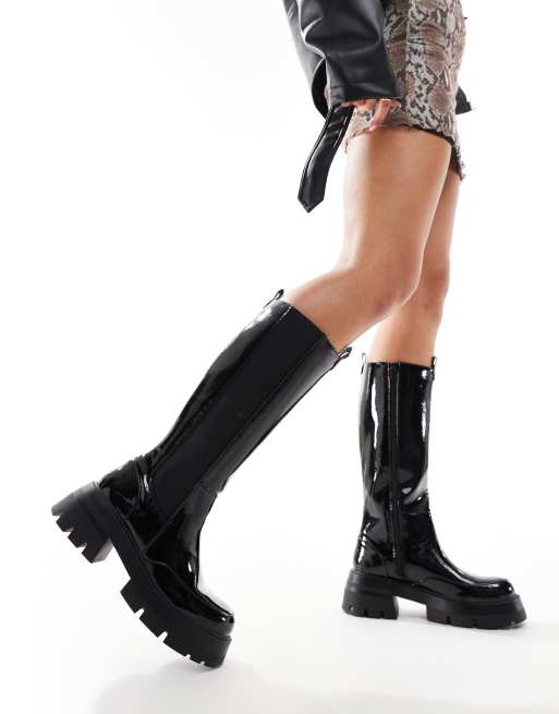 Public Desire – Bryant – Czarne wsuwane botki do kolan z imitacji lakierowanej, marszczonej skóry