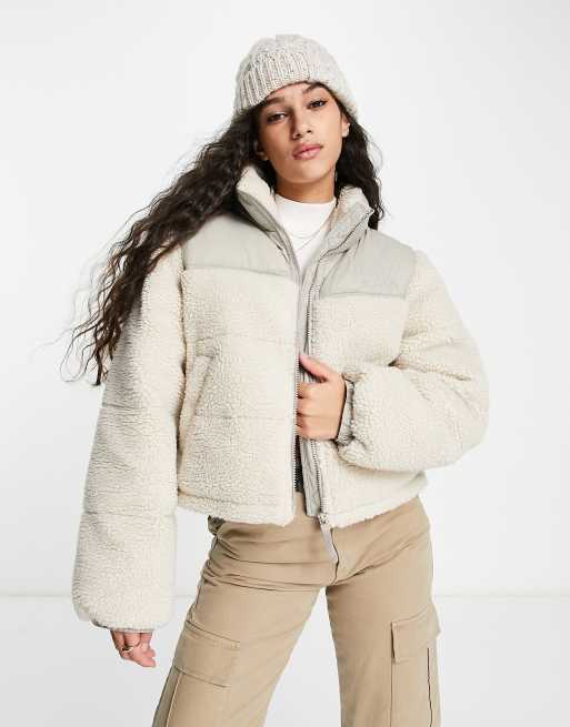Pull&Bear – Beżowy płaszcz ze sztucznego kożuszka z kontrastową wstawką