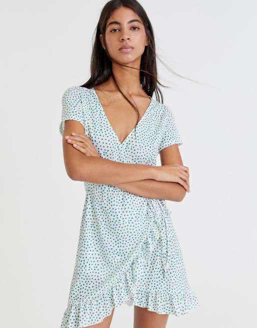Pull&Bear – Biała kopertowa sukienka w zielone groszki z falbankowym wykończeniem