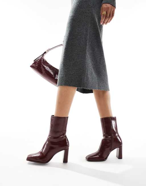Pull&Bear – Bordowe botki na obcasie z kwadratowymi noskami