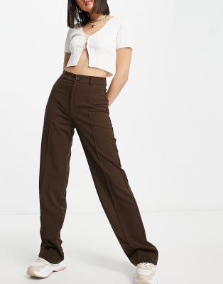Pull&Bear – Brązowe dopasowane spodnie z wysokim stanem i prostymi nogawkami