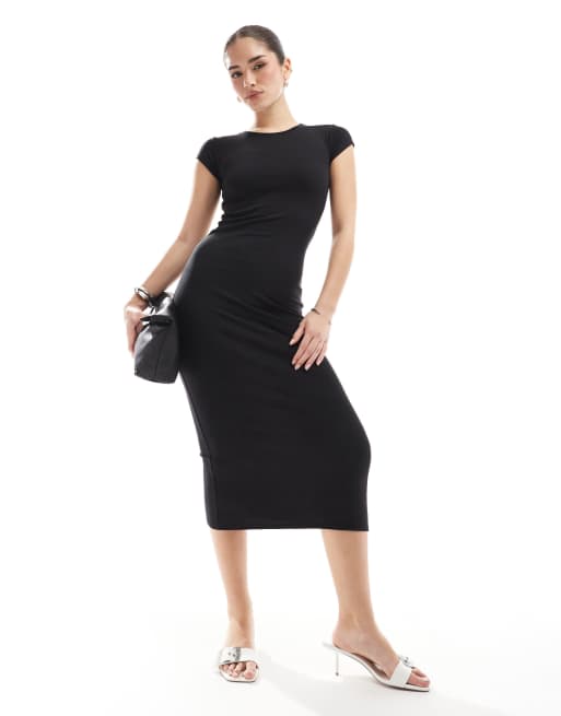 Pull&Bear – Czarna sukienka midi z krótkim rękawem z poliamidu