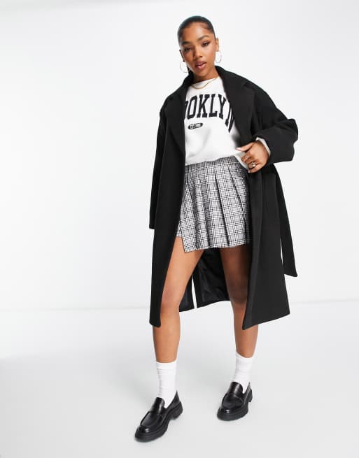 Pull&Bear – Czarny dopasowany płaszcz dwurzędowy z wiązaniem w talii